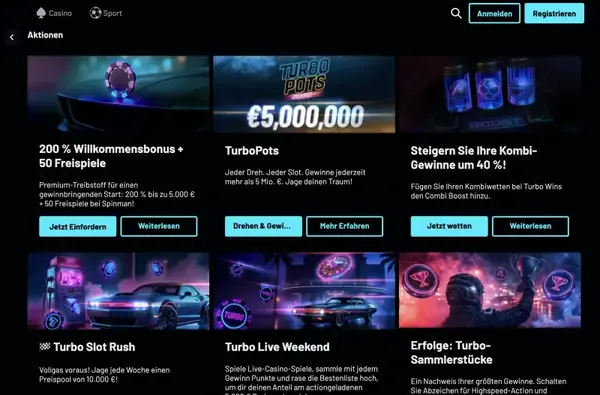 Voor regelmatig spel bieden we 10% Weekly Cashback, elke week bijgeschreven op basis van nettoverlies, tot €10.000. We bieden ook TurboPots Jackpot, een progressieve pot die kan oplopen tot €5.000.000 en beschikbaar is op elke spin die binnen het jackpotnetwerk kwalificeert. Sportfans kunnen Combi Boost gebruiken, waarmee accumulator-winsten tot 40% kunnen stijgen wanneer de bet voldoet aan de regels die in de sportsbook staan. Deze promoties zijn direct gekoppeld aan gameplay: cashback wordt automatisch bijgehouden, jackpots worden gekoppeld aan kwalificerende spins en sportboosts gelden voor geselecteerde weddenschapstypes. In je account toont Turbowins Casino de actuele voorwaarden en eventuele speciale deals op basis van codes onder de promodetails. Zo blijven de volledige kosten en waarde zichtbaar voordat je meedoet.